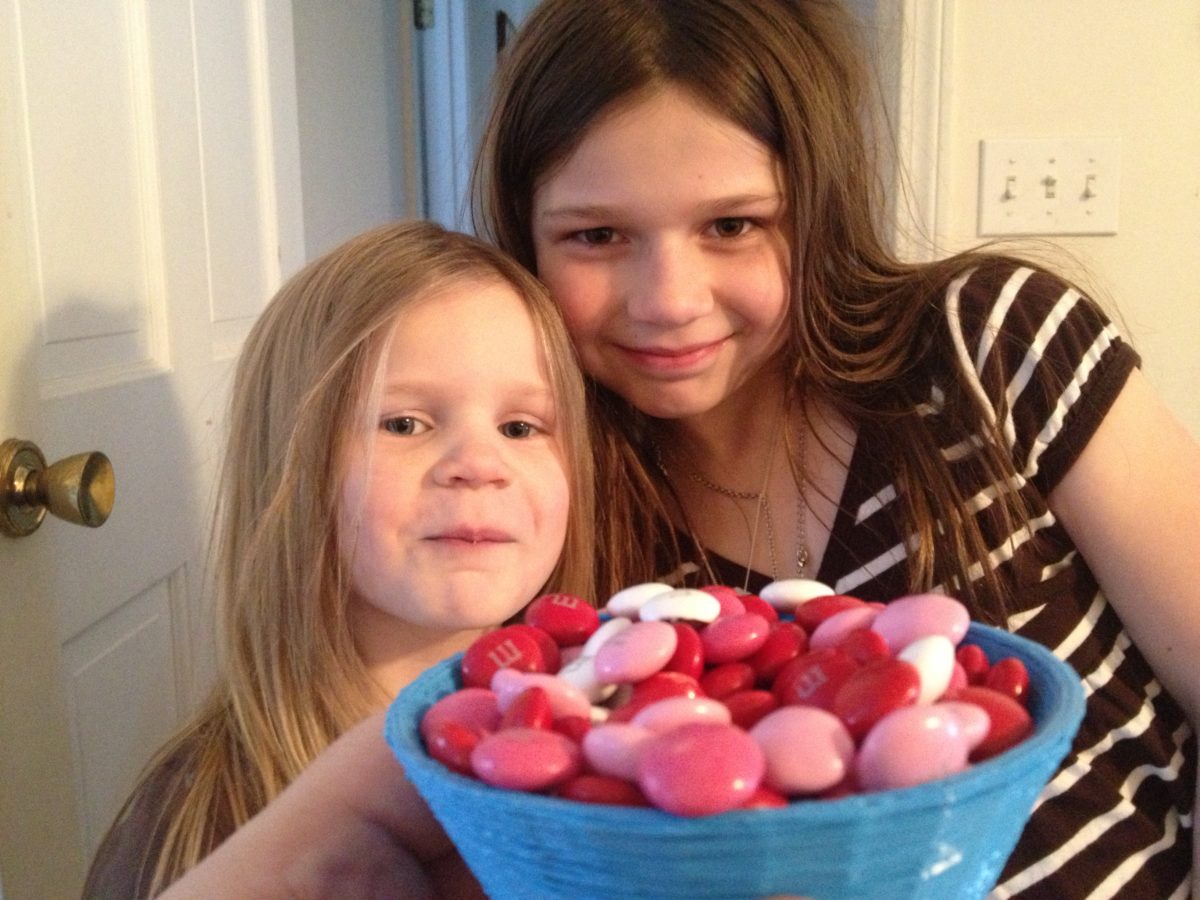 Here it is filled with M&Ms that I got on Valentine’s day, and the girls enjoying using it.